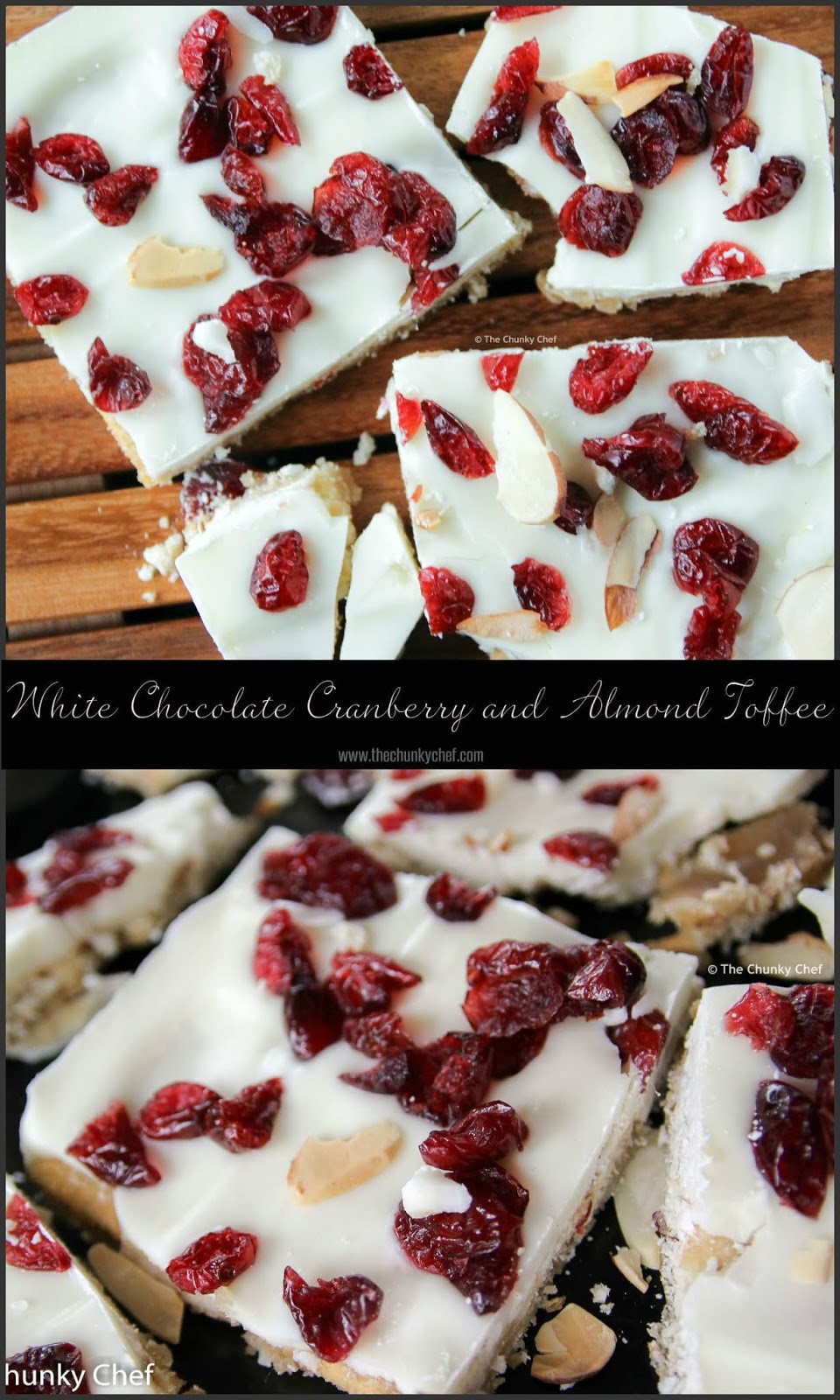 To see directions and complete recipes visit WHITE CHOCOLATE CRANBERRY AND ALMOND TOFFEE @ www.thechunkychef.com